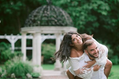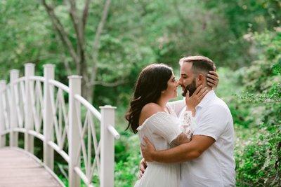 Every corner of Sayen Garden seems designed for romance. Curving pathways lead to quiet, intimate spots ideal for candid moments. Wooden bridges arch over gentle streams, and charming gazebos are nestled among lush flower beds. The stately Sayen House itself adds a classic touch to any engagement session, offering a refined contrast to the natural surroundings.