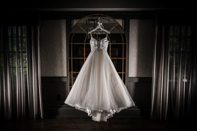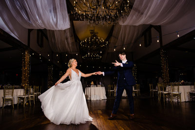 Offering a more classically elegant reception is The Belle of the Blue Bell located on the grounds of the Blue Belle Country Club. With its sparkling chandeliers and expansive dancefloor punctuated by ceilings and simple architecture, this grand ballroom provides an elegant backdrop for your wedding day.