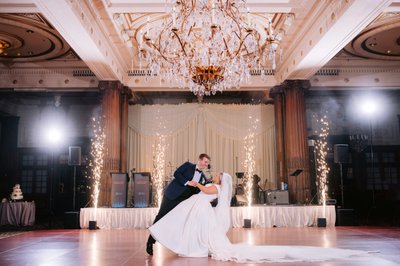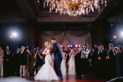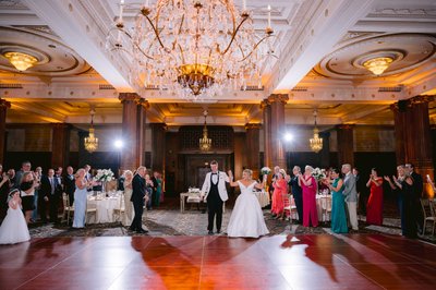 I love that as you take your first spin on the dancefloor as husband and wife a giant chandelier light up your every move in elegant grace and style, creating magnificent first dance images for your wedding album. The expansive dancefloor at the Crystal Tea Room can comfortably accommodate even the largest group of dancers, making sure no one is left out of your festivities. Couples have the option of having their new initials projected onto the floor beneath their feet. The perfect marriage of classic beauty and modern touches make the grand ballroom an ideal location to host a wedding reception. The resulting images are ageless, timeless, and stunning.